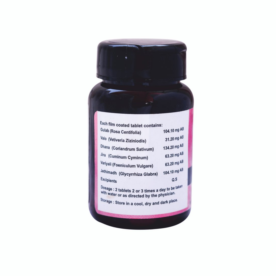 Composition: Each tablet contains: Gulab 104.10 mg, Valo 31.20 mg, Dhana 134.20 mg, Jira 63.20, Variyali 63.20 mg, Jethimadh 104.10 mg.