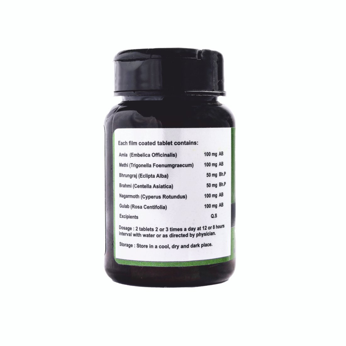 Composition: Each tablet contains: Amla 100 mg, Methi 100 mg, Bhrungraj 50 mg, Brahmi 50 mg, Nagarmoth 100 mg, Gulab 100 mg.