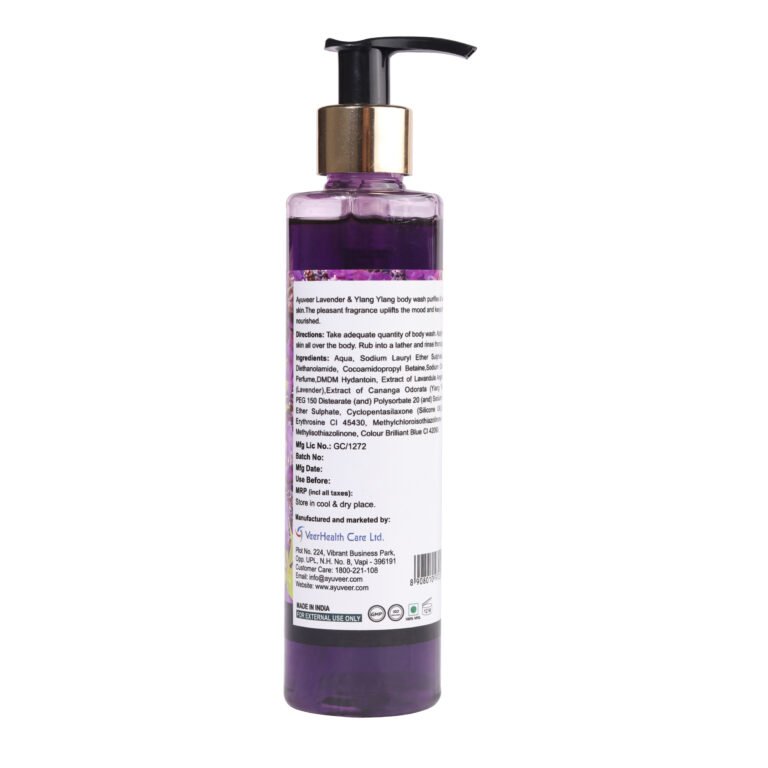 Ayuveer Lavender & Ylang Ylang body wash purifies & heals the skin.The pleasant fragrance uplifts the mood and keeps the skin nourished.