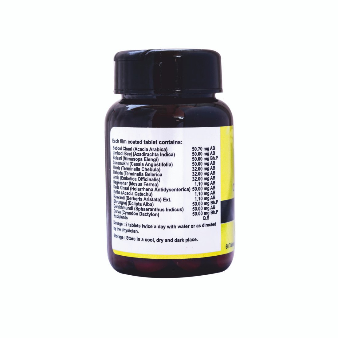 Composition: Each tablet contains: BaboolChaal 50.70 mg, Limbodi Beej 50.00 mg, Bolsari 50.00 mg, Sonamukhi 50.00 mg, Harde 32.00 mg, Baheda 32.00 mg, Amla 32.00 mg, Nagkeshar 1.10 mg, KadaChaal 50.00 mg, Katha 1.10 mg, Rasvanti 1.10 mg, Bhrungraj 50.00 mg, Gorakhmundi 50.00 mg, Durva 50.00 mg.