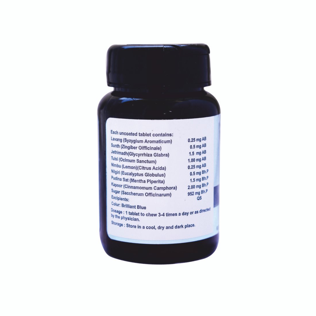 Composition: Lavang 0.25 mg, Sunth 0.5 mg, Jethimadh 1.5 mg, Tulsi 1.00 mg, Nimbu 0.25 mg, Nilgiri 0.5 mg, Pudina Sat 1.5 mg, Kapoor 2.00 mg, Sugar 952 mg.