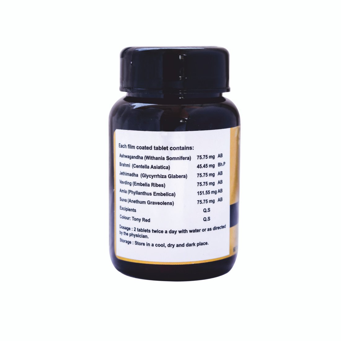 Composition Each tablet contains: Ashwagandha 75.75 mg, Brahmi 45.45 mg, Jethimadha 75.75 mg, Vavding 75.75 mg, Amla 151.55 mg, Suva 75.75 mg.